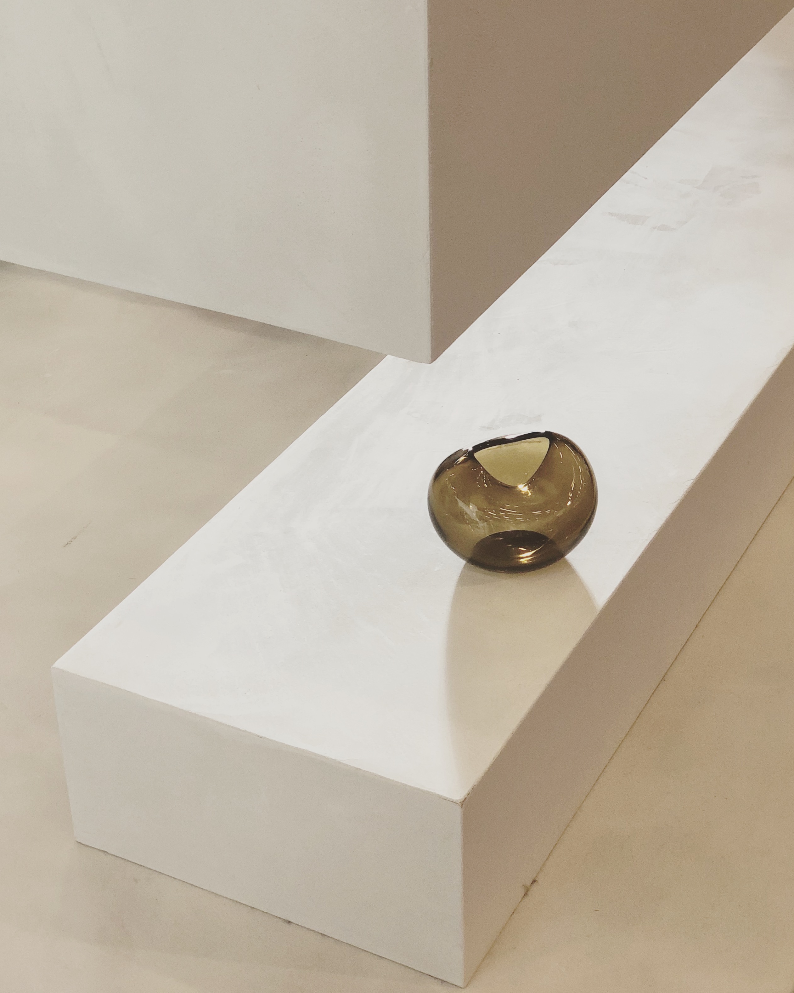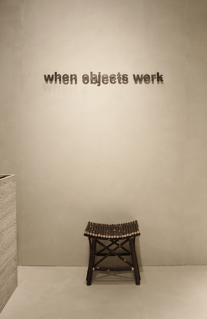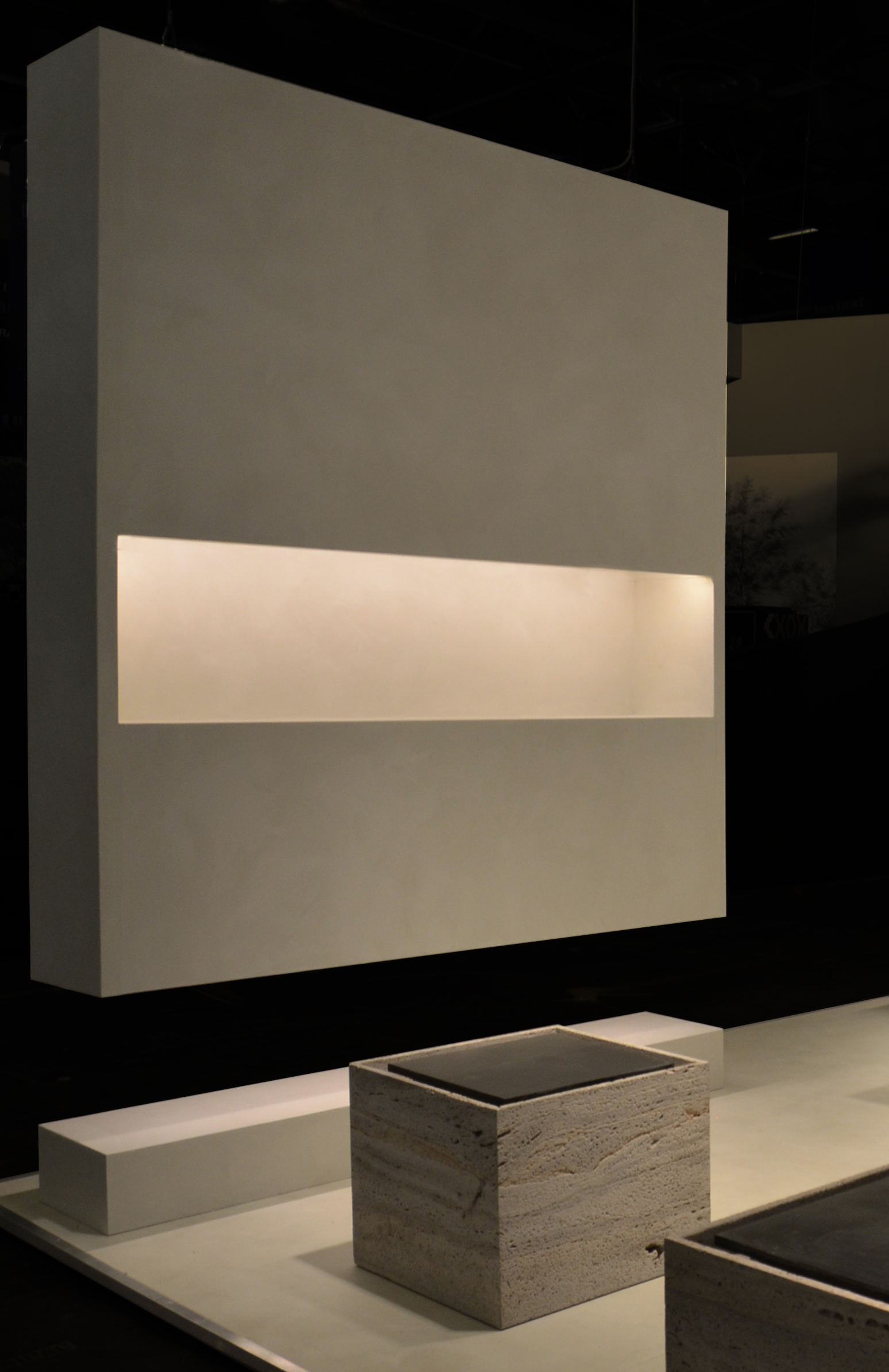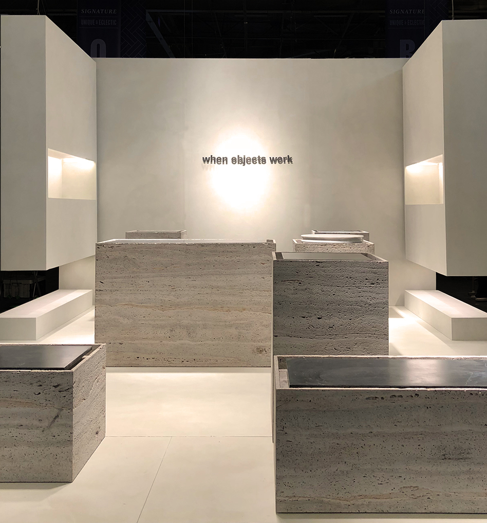 Des volumes flottants dans les longs couloirs des halls d'exposition Maison et Objet rompent le cadre monotone. Ces modules ont été conçus pour être réutilisables pour des futures expositions. Les blocs de travertin gris dessinés par Nicolas Schuybroek, permettent de présenter les objets aux différents niveaux et sont complémentaires de son décor.